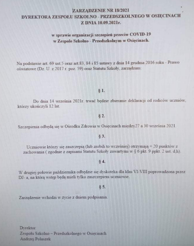 W piątek (10.09.2021) dyrektor szkoły podstawowej w Osięcinach (woj. kujawsko-pomorskie), Andrzej Polaszek, wydał rozporządzenie w sprawie organizacji szczepień dla uczniów. W rozporządzeniu znalazł się zapis dyskryminujący niezaszczepionych. Dyrektor zarządził, że zaszczepieni uczniowie dostaną dodatkowe 20 punktów ze sprawowania i zostanie dla nich urządzona dyskoteka, na którą nie będą wpuszczani niezaszczepieni.